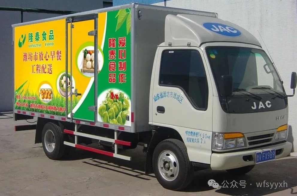 ——车身上,“隆泰匠心二十年,健康营养每一天”标语、包子饺子玩偶、隆泰食品主打产品以及代表潍坊地标建筑的形象跃然眼前;