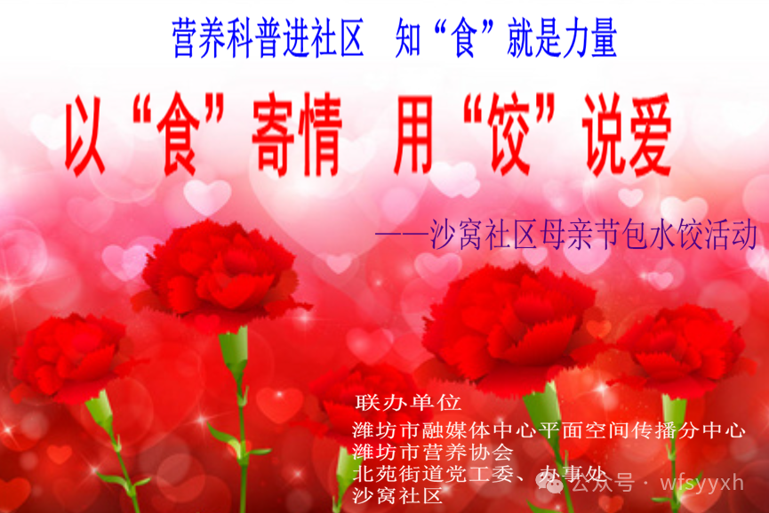 5月10日,“营养科普进社区 知‘食’就是力量”·“以食寄情、用‘饺’说爱”——沙窝社区母亲节包水饺活动在沙窝社区服务中心举行。活动由潍坊市融媒体中心平面空间传播分中心、潍坊市营养协会、北苑街道党工委办事处、沙窝社区联合举办。现场还举行了“潍坊市营养协会营养科普宣讲基地”挂牌仪式。