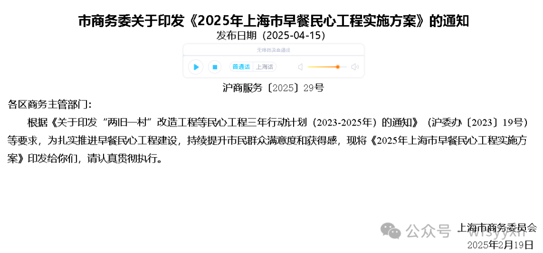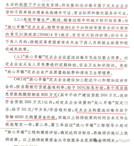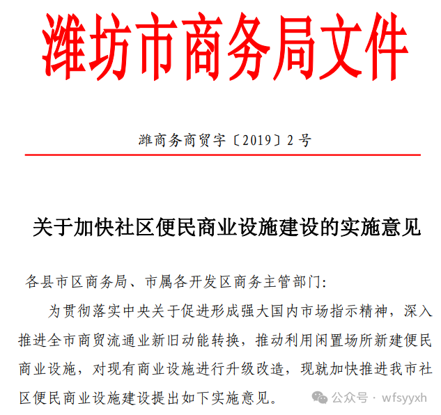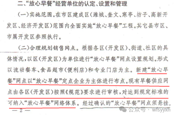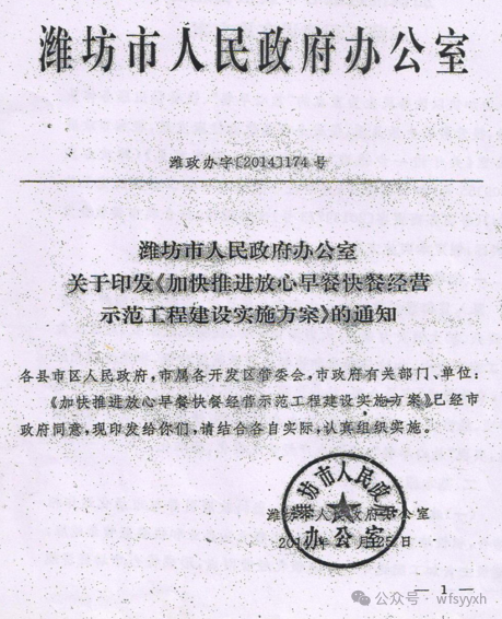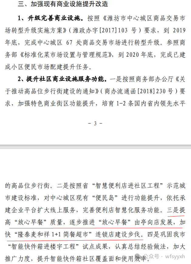 →→→ 2019年,潍坊市商务局印发《关于加快社区便民商业设施建设的实施意见》。《意见》中指出,为贯彻落实中央关于促进形成强大国内市场指示精神,深入推进全市商贸流通业新旧动能转换,推动利用闲置场所新建便民商业设施,对现有商业设施进行升级改造,就加快推进我市社区便民商业设施建设提出实施意见。其中,在“因地制宜,发展多业态便民商业设施”方面,明确提出:据城市规划和商业网点规划,结合区位特点,坚持公益性、便利化原则,建设完善以下业态的商业设施。……4、“放心早餐”车。持续推动“放心早餐”建设,加快人口密集区、偏远社区“放心早餐”车网点布局和老旧餐车提升更换。中心城区每年新设、更换“放心早餐”车 40 辆……;在“加强现有商业设施提升改造”方面,明确提出:……三是提高“放心早餐”质量,逐步推进“放心早餐”由亭向店发展,加快“隆泰麦和祥 1+1 简餐超市”连锁店建设步伐……在“落实责任,加大政策支持”方面,明确提出:……2、加大政策扶持。按照先建后补的原则,市财政对“放心早餐”和“智慧便利店进社区”工程建设给予政策扶持。根据市政府办公室《关于印发加快商贸流通业创新发展实施方案的通知》(潍政办字[2017]140 号)精神,对 2020 年底前,市“放心早餐”定点企业,在中心城区按标准新建、更换的早餐车和为实现早餐车逐步向室内转型发展所建的的早餐固定经营门店给予补助,每个补助 5000 元。