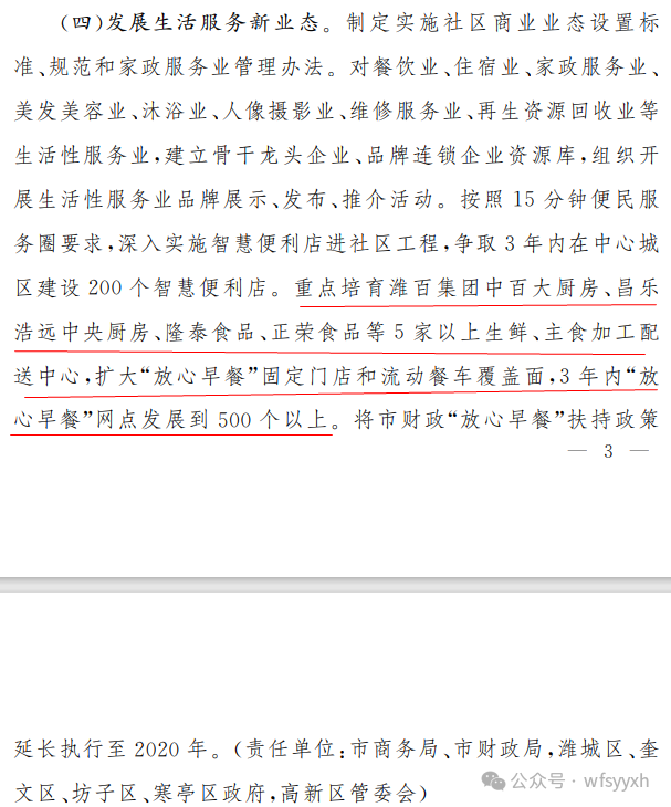 →→→ 2017年,潍坊出台《加快商贸流通业创新发展实施方案》。方案提出,由市商务局、市财政局,潍城区、奎文区、坊子区、寒亭区政府,高新区管委会等牵头,发展生活服务新业态。制定实施社区商业业态设置标准、规范和家政服务业管理办法。对餐饮业、住宿业、家政服务业、美发美容业、沐浴业、人像摄影业、维修服务业、再生资源回收业等生活性服务业,建立骨干龙头企业、品牌连锁企业资源库,组织开展生活性服务业品牌展示、发布、推介活动。按照15分钟便民服务圈要求,深入实施智慧便利店进社区工程,争取3年内在中心城区建设200个智慧便利店。重点培育潍百集团中百大厨房、昌乐浩远中央厨房、隆泰食品、正荣食品等5家以上生鲜、主食加工配送中心,扩大“放心早餐”固定门店和流动餐车覆盖面,3年内“放心早餐”网点发展到500个以上。将市财政“放心早餐”扶持政策延长执行至2020年。