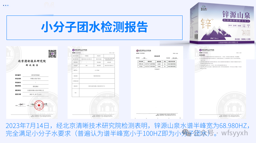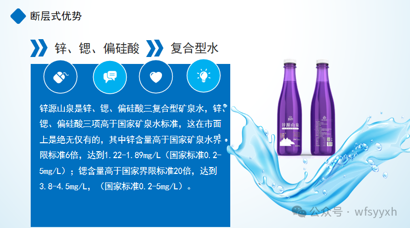 王贤中介绍说,五莲县锌源山泉水有限公司成立于2021年12月6日,注册资金2000万元。公司坐落在山清水秀、茶翠飘香的“中国最美生态旅游示范县”五莲县,是一家专业生产瓶装水的企业,拥有360ml、460ml、500ml三种规格产品。 锌源山泉水源地位于五莲县汪湖镇小湖村以南,地处沂沭大断裂带莒县-安丘中断,地质结构复杂,地壳运动频繁。水源为-300米地下水,水中含有锌、锶、偏硅酸、钙、镁等十余种对人体有益的矿物质微量元素,其中锌、锶、偏硅酸三项含量达到国家矿泉水标准,锌含量为1.22mg/L,锶含量为4.14mg/L,偏硅酸含量为32mg/L,特别是锌、锶两种元素的含量分别高出国家矿泉水界限标准的6倍、20倍;PH值7.8±0.5,活性高,含氧量高,冰点低(静态冰点-10℃左右),还是小分子团水(68.98HZ),水源稀缺、得天独厚,是一款真正的锌、锶、偏硅酸三复合型矿物质水。